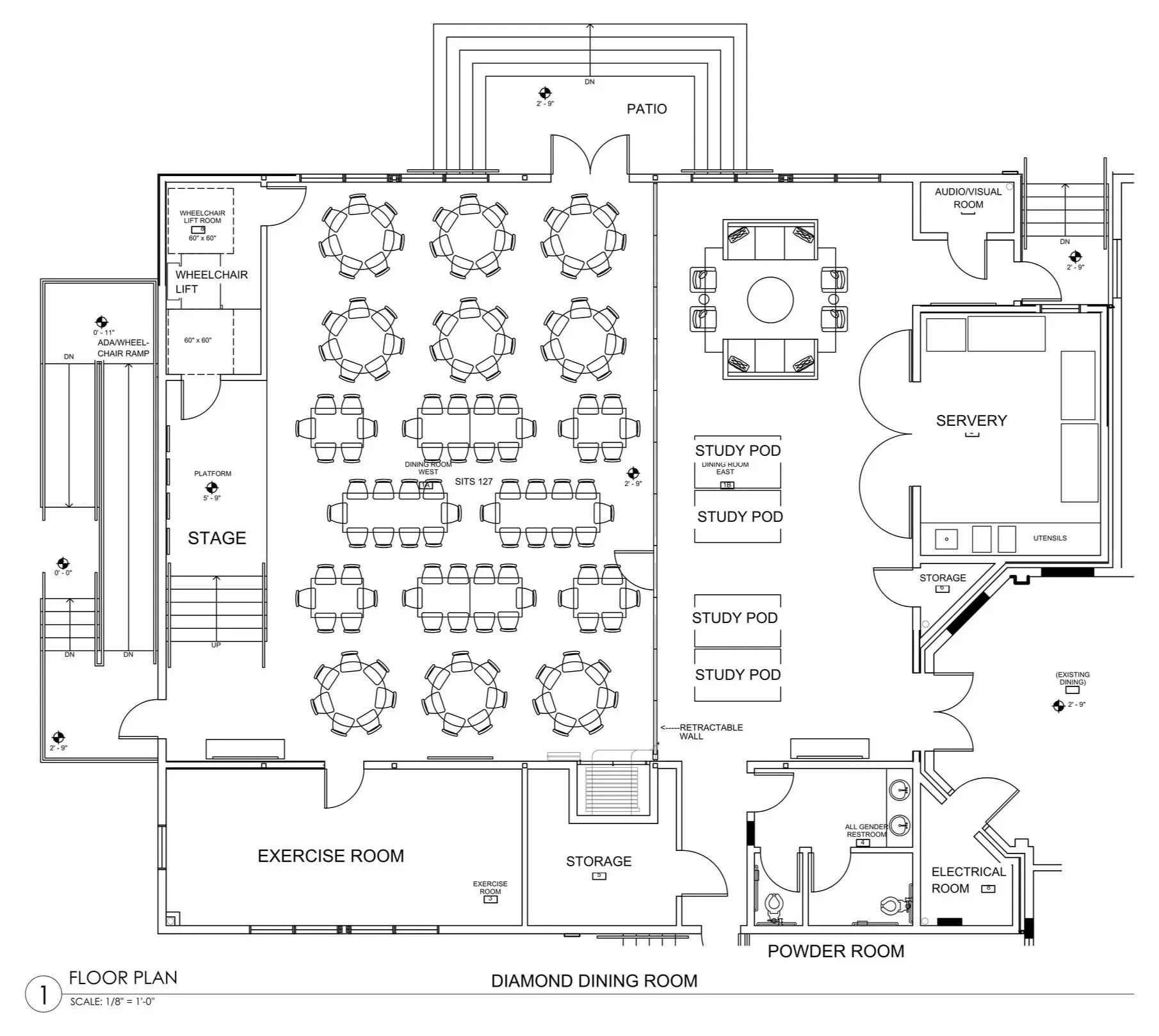 The new Diamond Dining Room (DDR) is approximately 3,800 square feet in size. It is a rectangular-shaped building which is replacing the Lower Dining Room (LDR). The new building will sit on the same site as the LDR but it will be almost four times the size (extending out towards 28th street and much closer to the Tri-Delta sorority house). The new DDR was built to accommodate seating for 120 people at round and rectangle tables for dining. A movable partition was built into the room to enable the room to be divided into two separate rooms, so one section of the room can be used for dining while the other part of the room is set up for lounging and studying. The room will also have a stage at the back (west side) of the room for members to hold their meetings or for guest speakers. The room will also have moveable "study pods" for use for studying and meeting with groups of 4 or less people. Finally, the room will include a new guest powder room, buffet/servery, and an exercise area. The building will also include a new ADA access, which will allow a person to gain access to the entire first floor of the Alpha Psi sorority house without having to go up any stairs. Additionally, solar panels have been installed on the roof of the new building which will enable the Alpha Psi House Corporation to rely on solar energy for future energy needs!